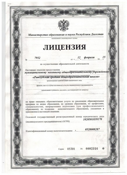 | Полное наименование образовательной организации* | Муниципальное казенное общеобразовательное учреждение Ратлубская средняя общеобразовательная школа |